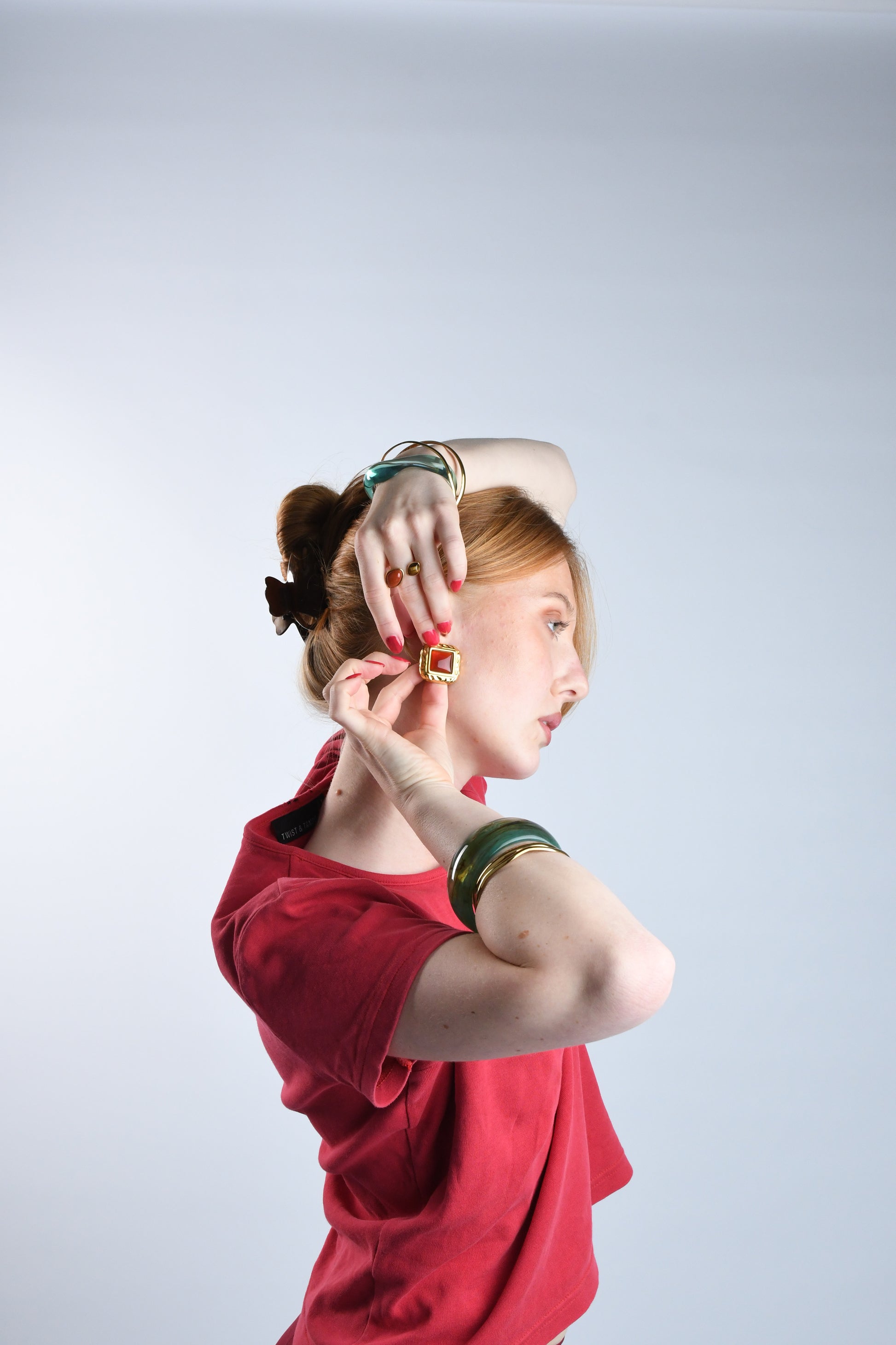 This elegant gold ring features a stunning red and brown stone, beautifully set against a stainless steel band with 18k gold PVD plating. Waterproof and adjustable in size, it offers both luxury and versatility, ensuring a perfect fit and long-lasting shine. A sophisticated accessory that adds a pop of color and elegance to any look.
